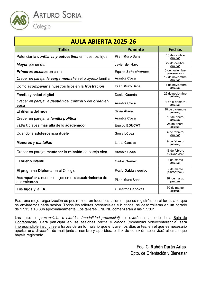 Aula abierta es un foro de diálogo, formación y encuentro que el Colegio Arturo Soria ofrece a las familias. Esta invitación se hace extensible a todos aquellos amigos y familiares que estén interesados en cualquiera de las ponencias, así como a todos los miembros de la Comunidad Educativa.