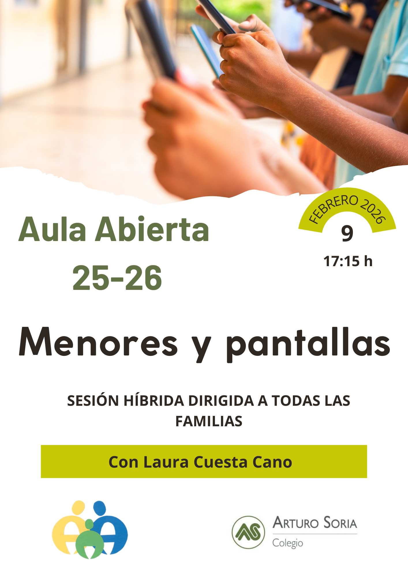 Os informamos que el próximo lunes día 9 de febrero, de 17:15h a 18:15h, en formato HIBRIDO, en el AULA ABIERTA 25-26 volveremos a mirar a nuestros alumnos, con un taller titulado: “MENORES Y PANTALLAS”