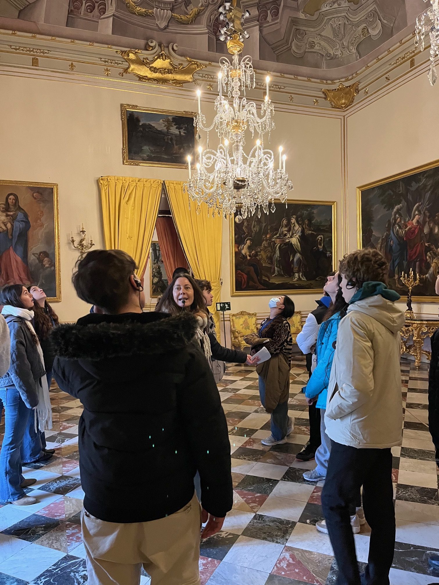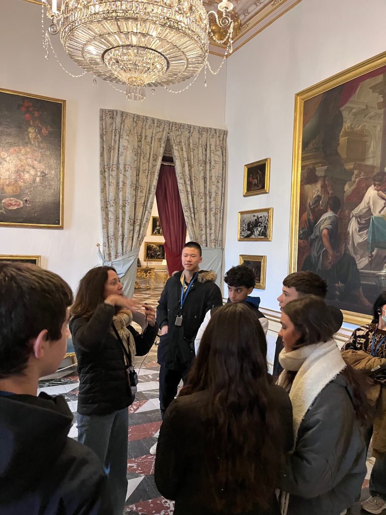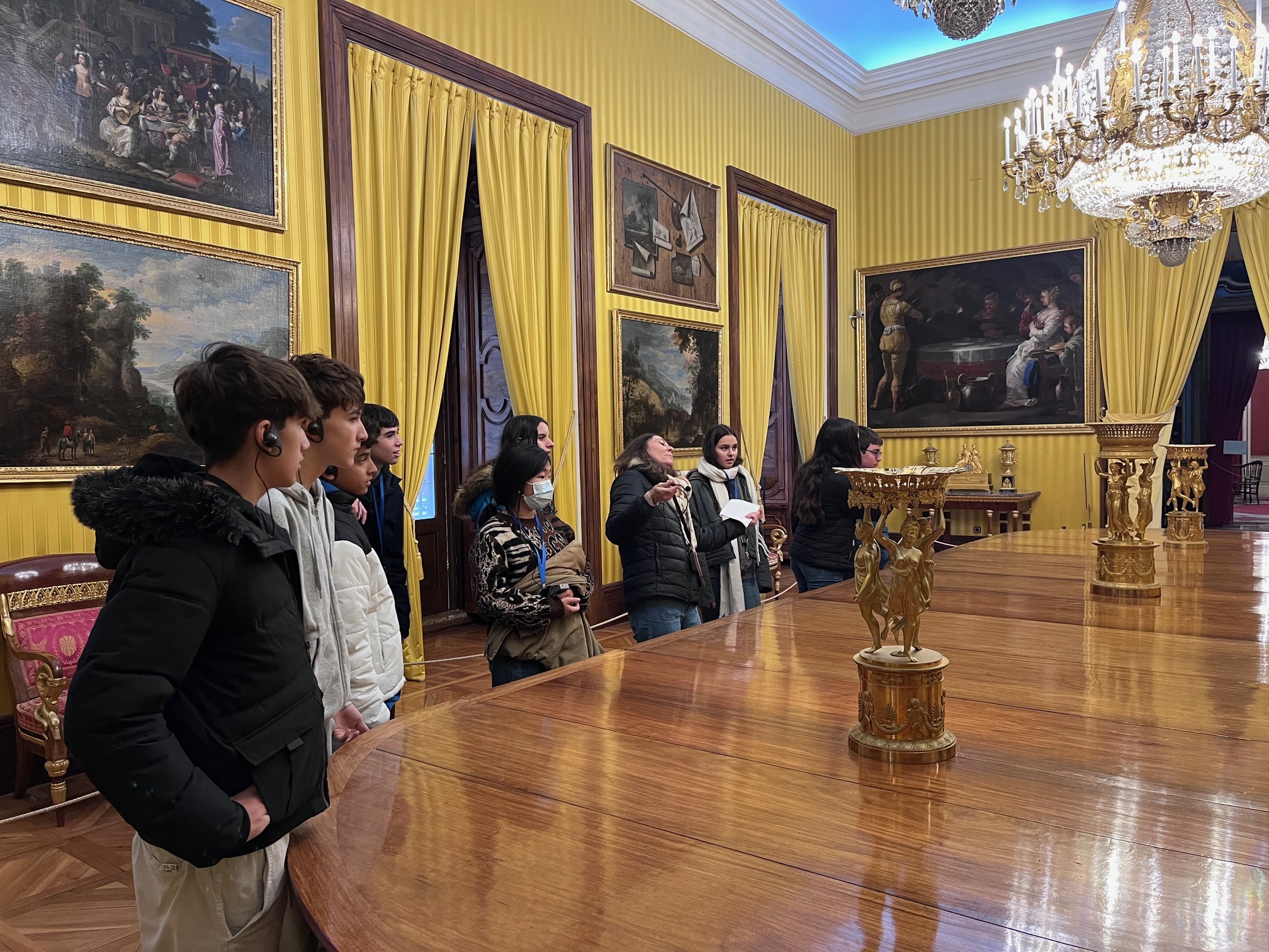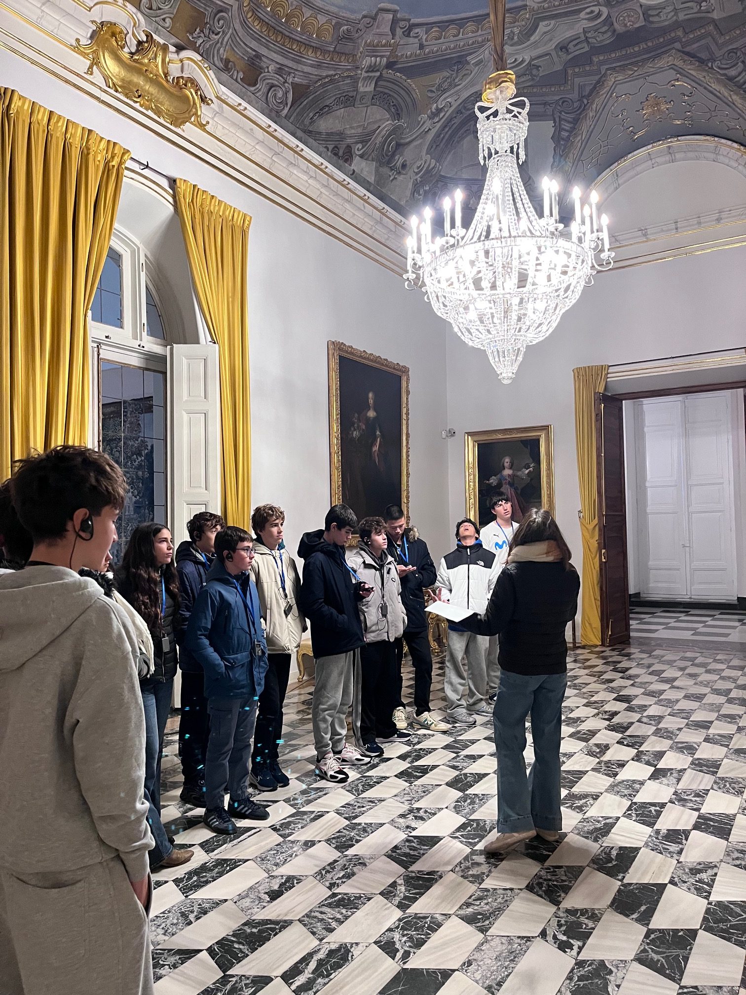 Posteriormente, los alumnos recorrieron el palacio en sí. La visita se organizó en torno a la figura del rey, sus peculiaridades y el papel desempeñado por su segunda esposa, Isabel de Farnesio. Los guías acompañaron al grupo a través de las estancias principales, como los aposentos reales, la sala de música y el comedor, entre otras.