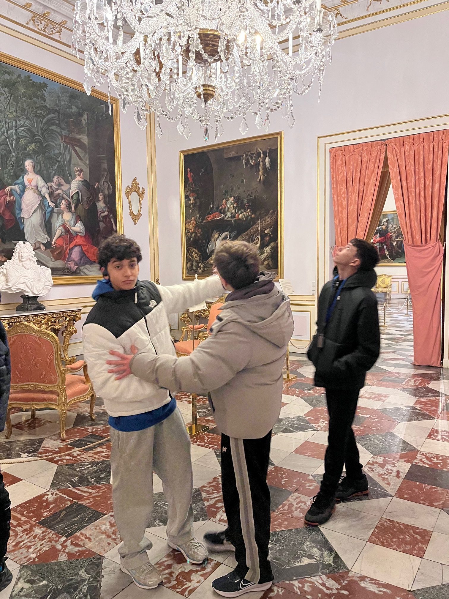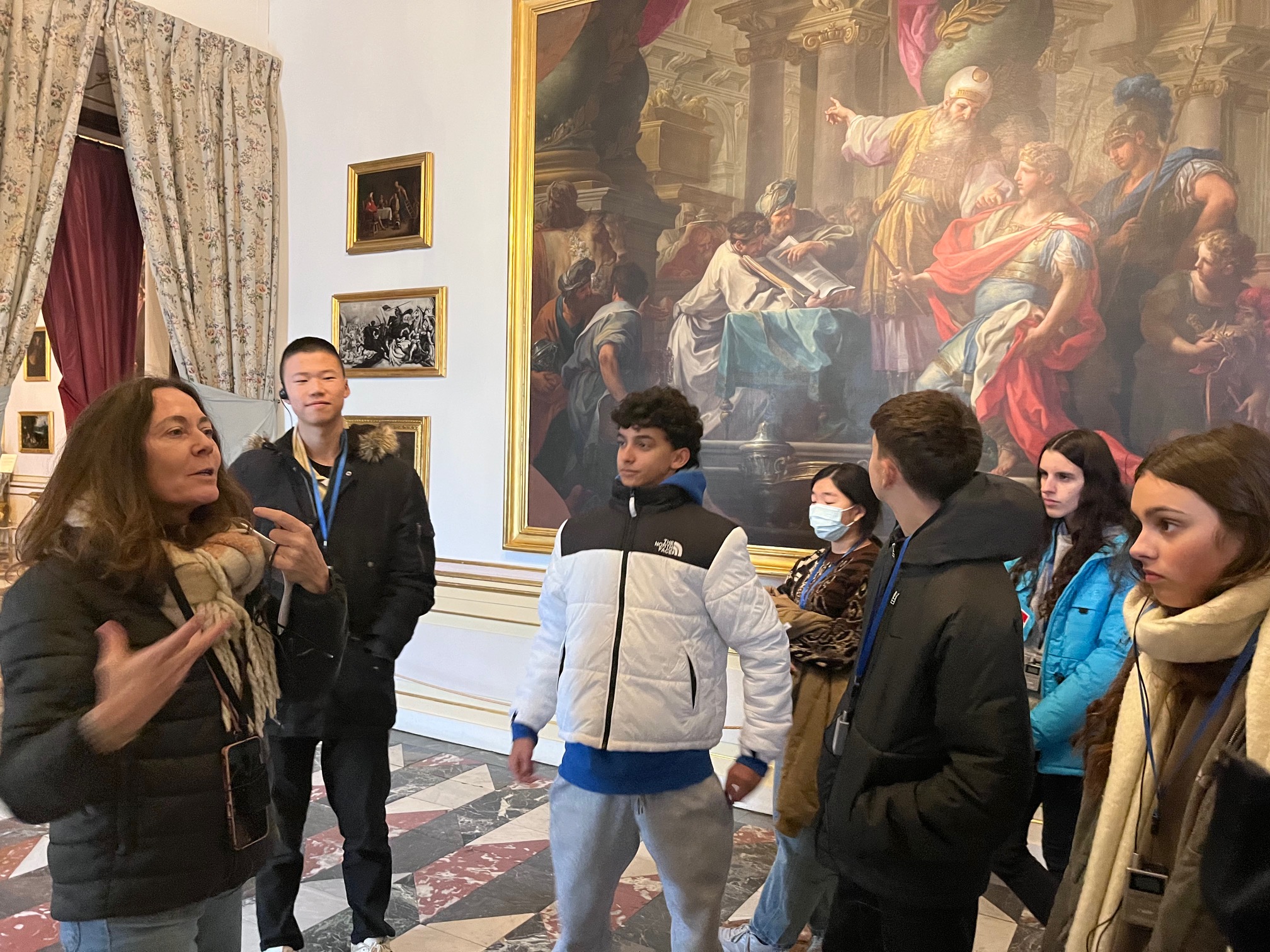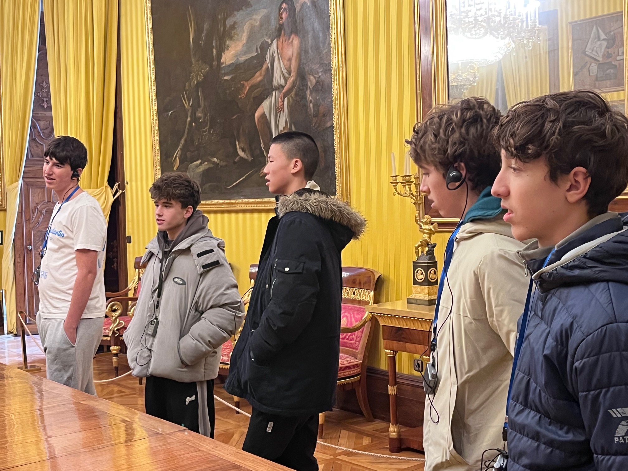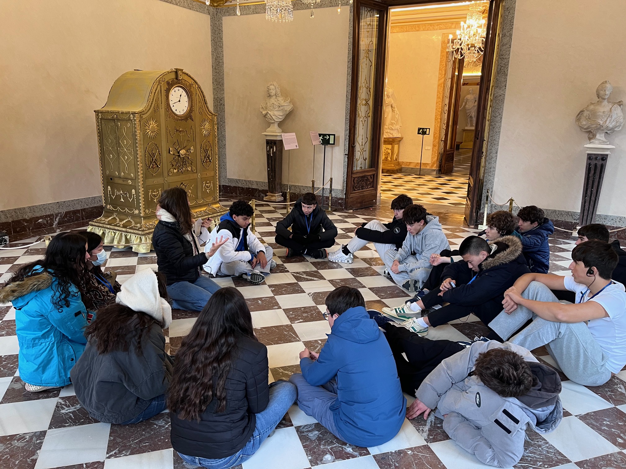 Posteriormente, los alumnos recorrieron el palacio en sí. La visita se organizó en torno a la figura del rey, sus peculiaridades y el papel desempeñado por su segunda esposa, Isabel de Farnesio. Los guías acompañaron al grupo a través de las estancias principales, como los aposentos reales, la sala de música y el comedor, entre otras.